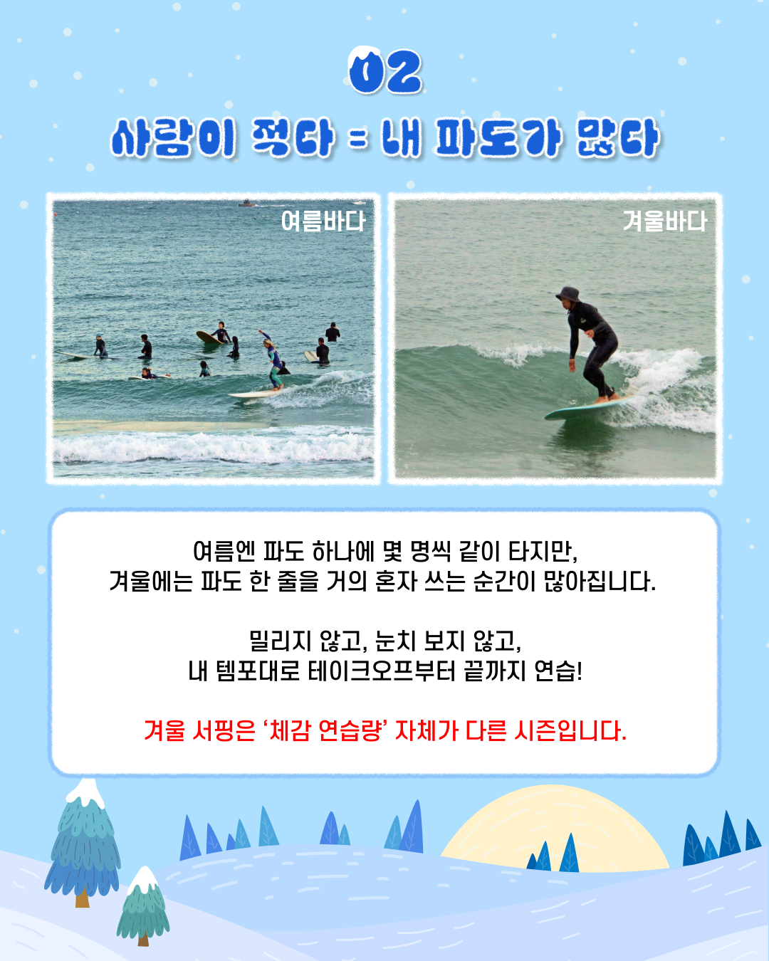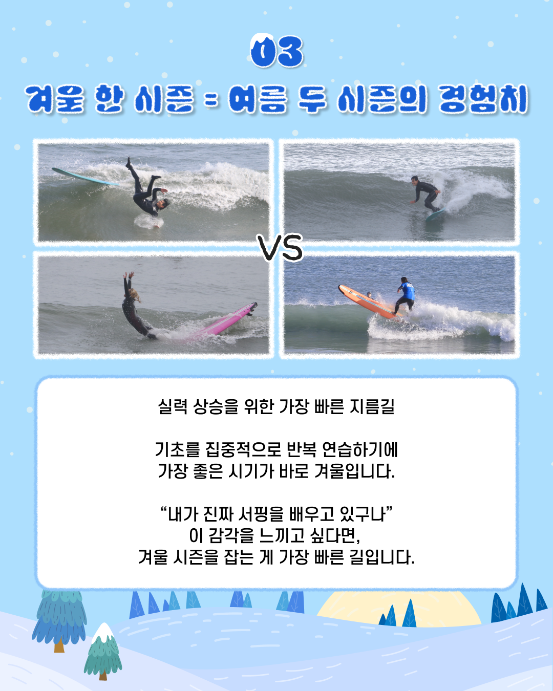 겨울 서핑은 체감 연습량 자체가 다릅니다.