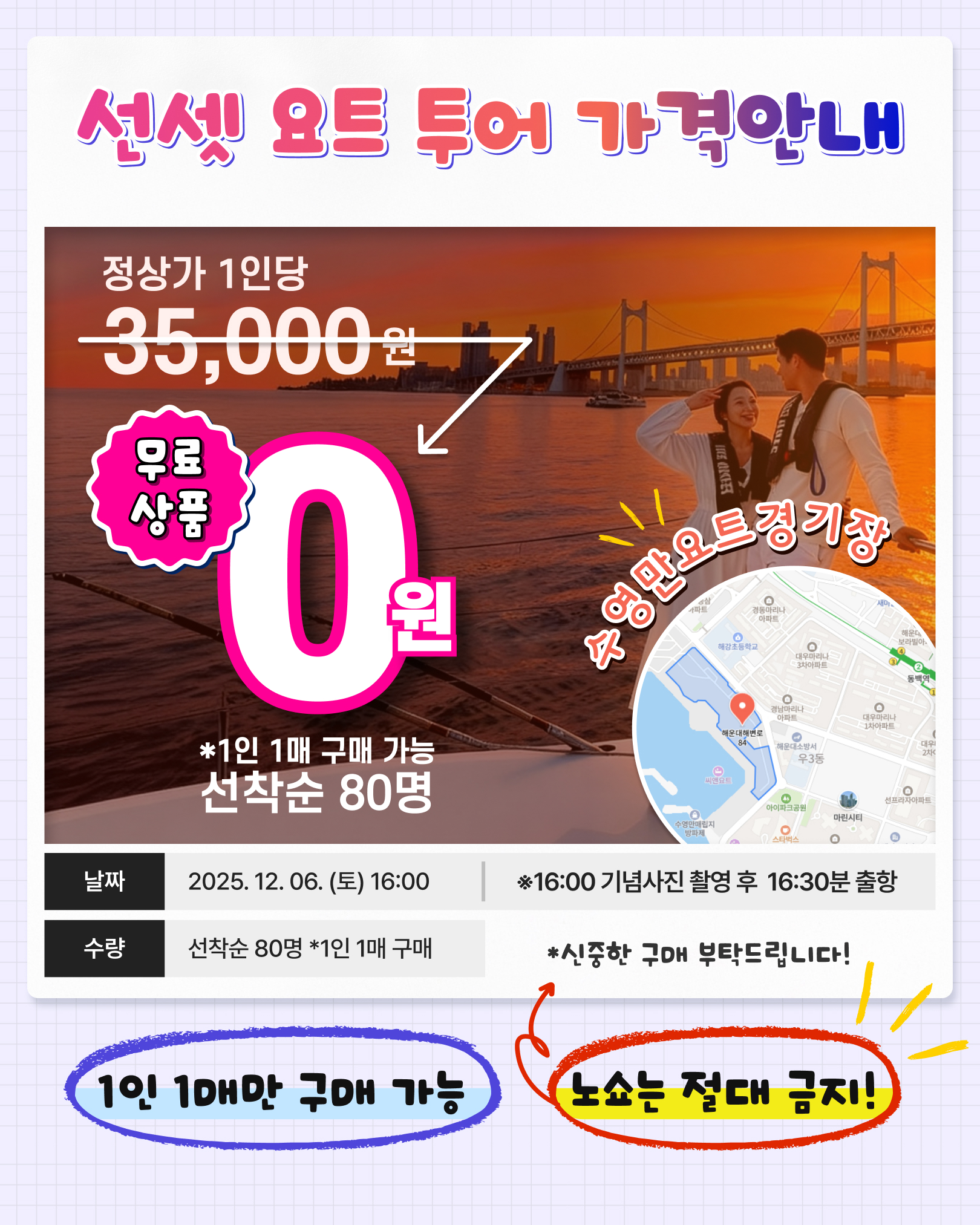 [0원 특가] 2025 해양레저문화 이벤트 선셋 요트투어 & 송정 조개홀릭 식사권 무료 판매