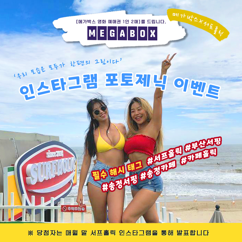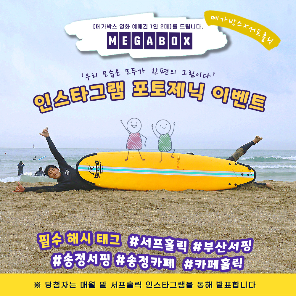 [이벤트 내용] 1. 부산 송정 #서프홀릭 #카페홀릭 이용 후 2. #인스타그램 에 필수 해시태그와 함께 멋지고 이쁘고 재밌는 사진을 올려주시면 ~ ♡ 3. 추첨을 통해 친구랑 연인 가족들과 함께 즐길 수 있도록 4. 전국 #메가박스 에서 보실 수 있는 영화티켓 '1인 2매' 를 드립니다.♡♡