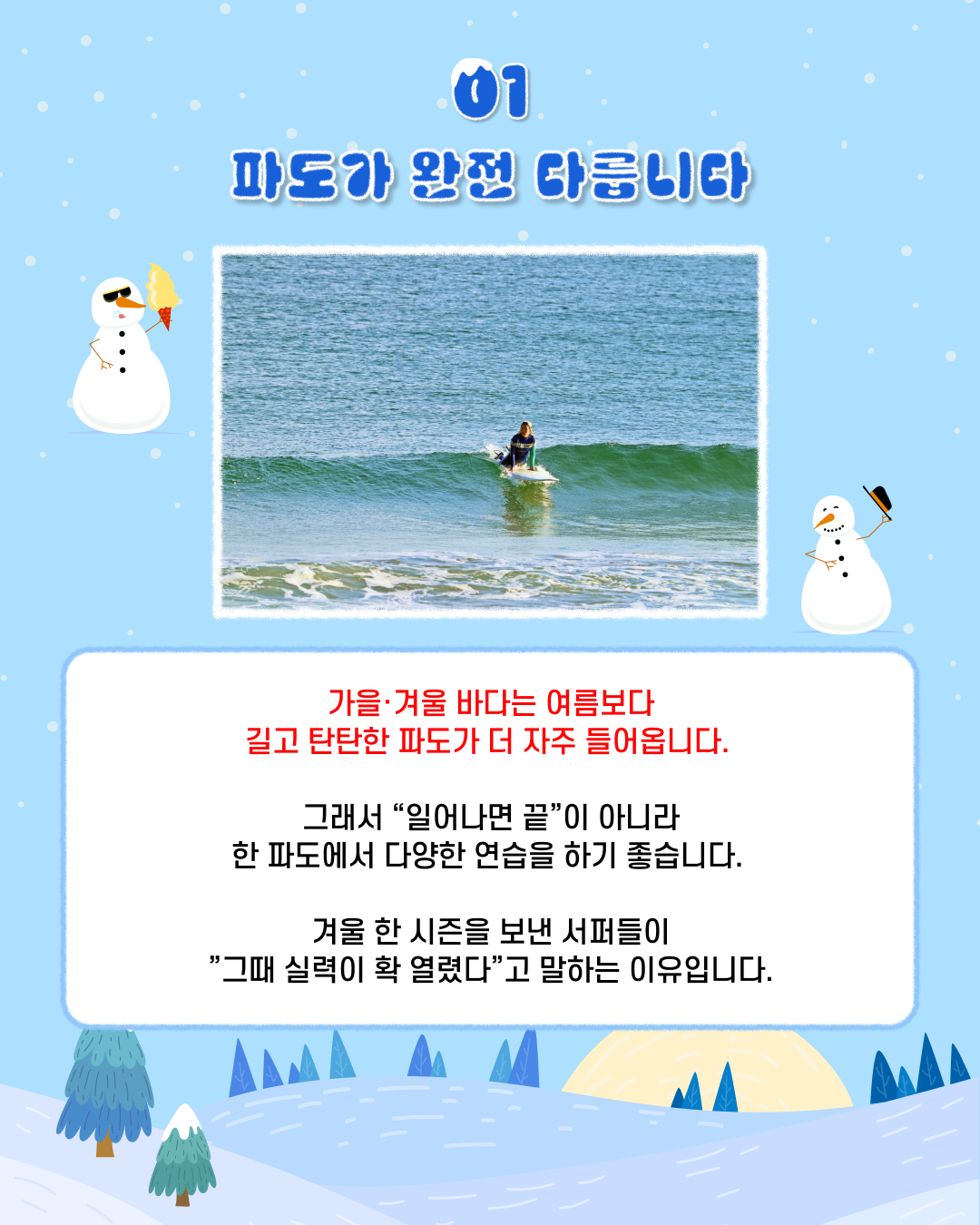 겨울 서핑은 체감 연습량 자체가 다릅니다.