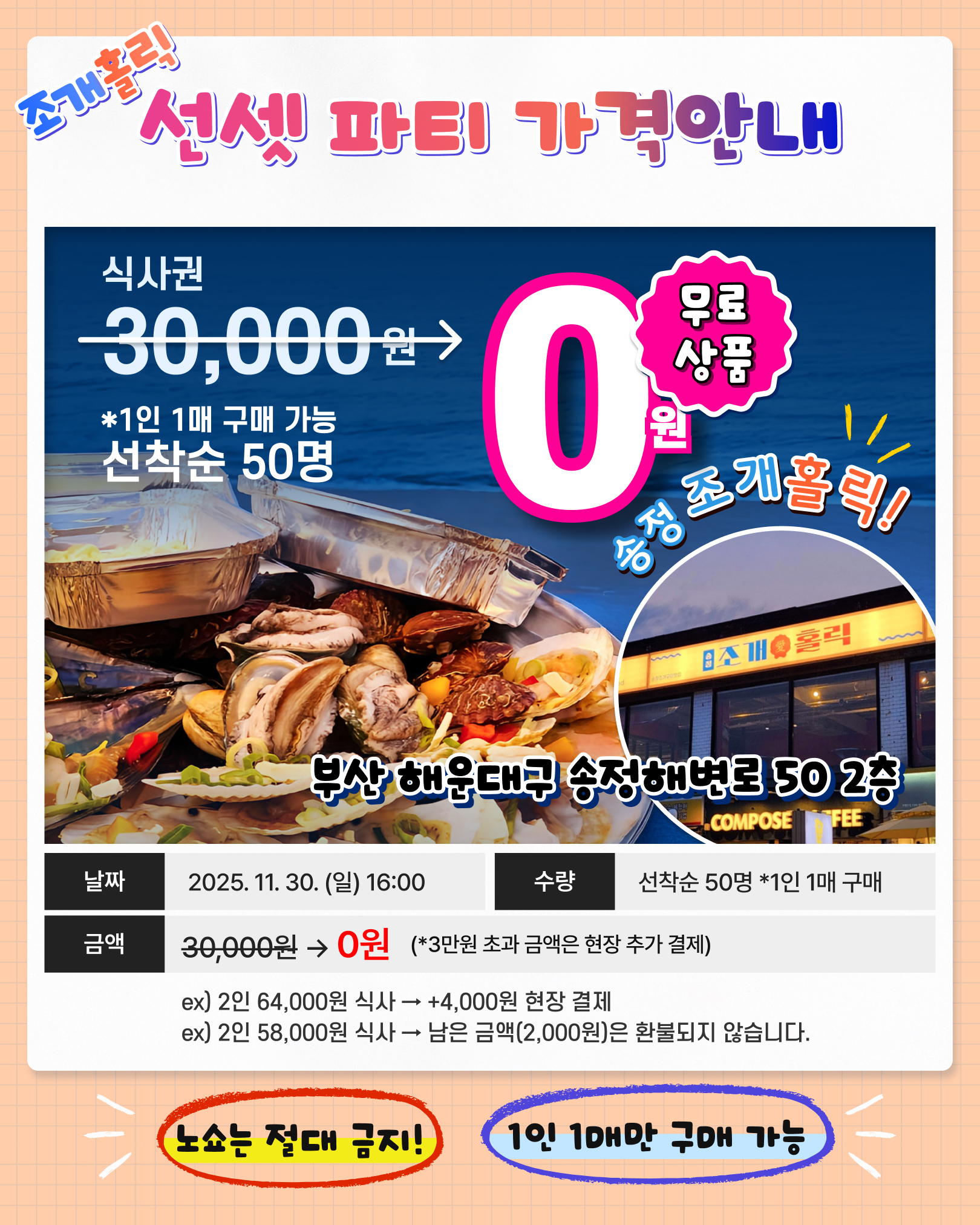 조개홀릭 선셋 파티 식사권 (무료 상품)