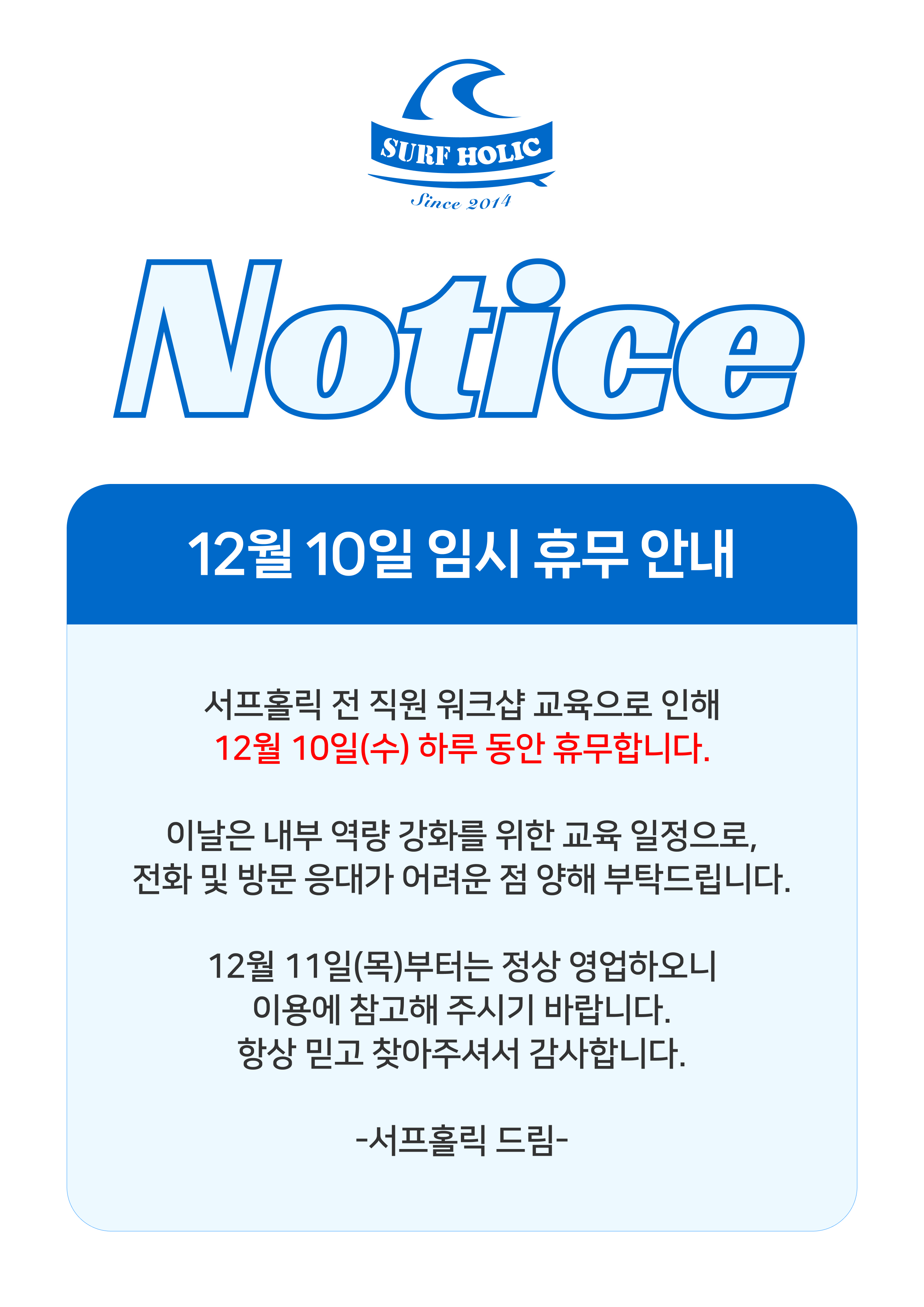 서프홀릭 송정 본점 12월 10일 수요일 임시 휴무 안내