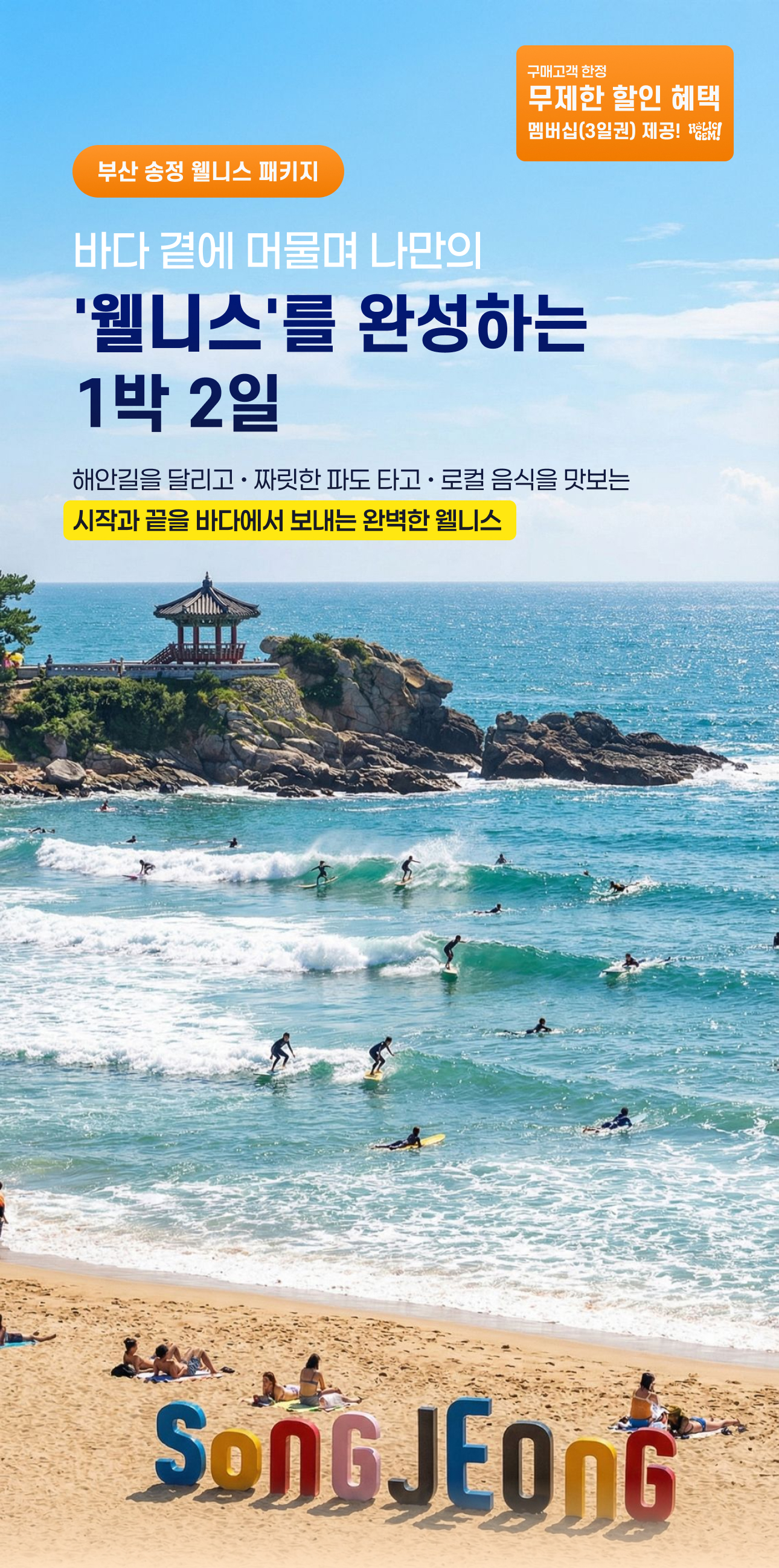 [1박 2일 여행 패키지] 지마켓 바다가는달 부산 송정 웰니스 서핑 체험 + 맛집 + 숙박 여행