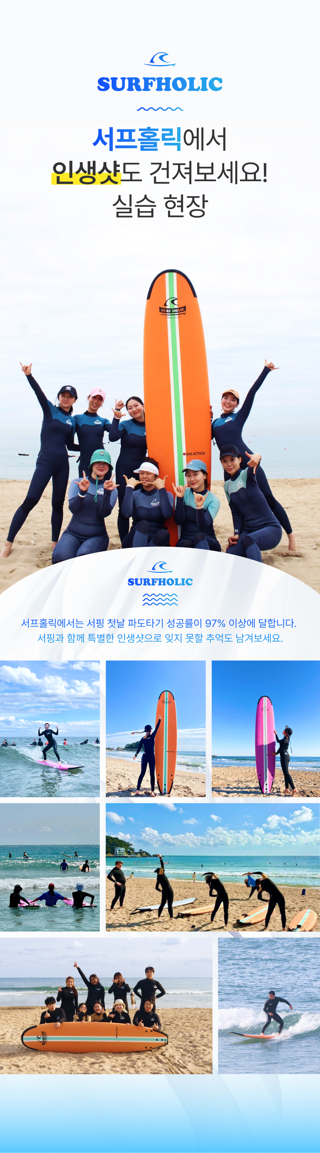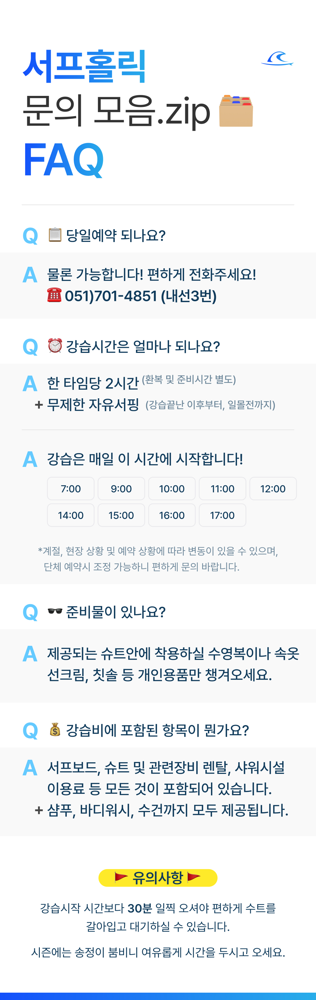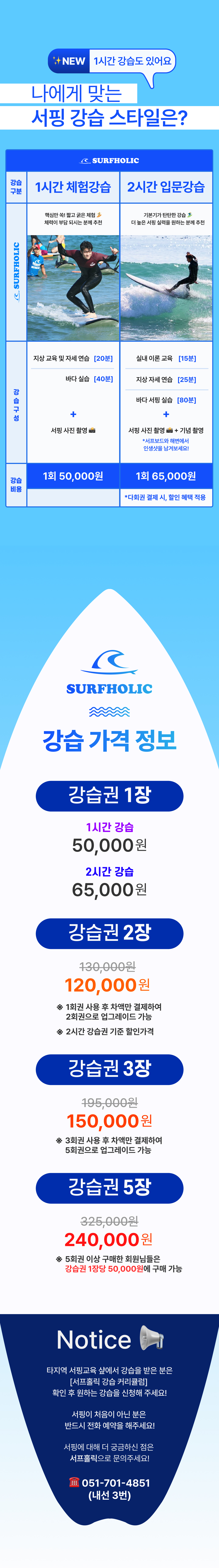 - 기상악화 : 태풍주의보, 태풍경보, 풍랑경보, 기타 서프홀릭 대표코치 판단에 의한 강습불가 인 경우 (비 내린다고 강습이 취소 되거나 연기 되진 않습니다.)