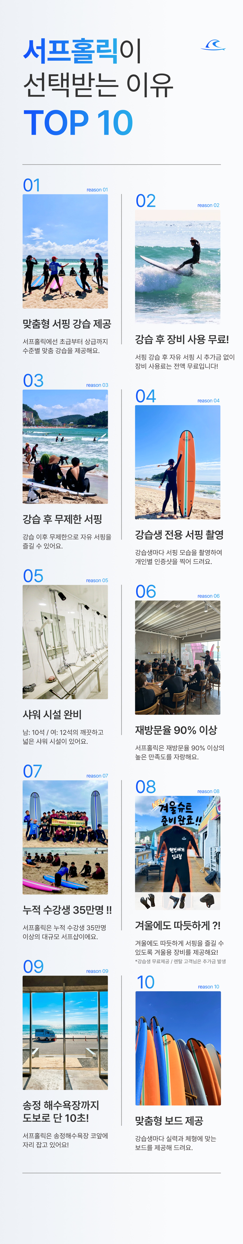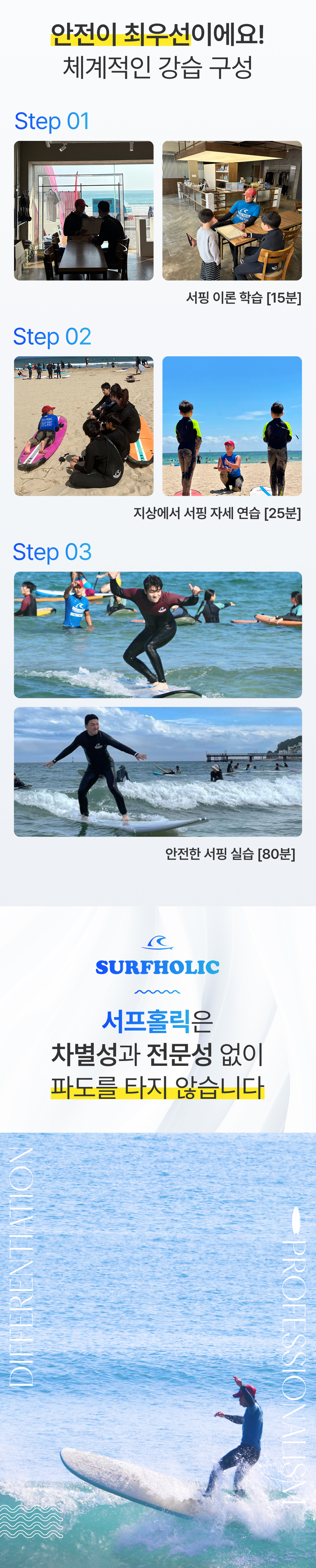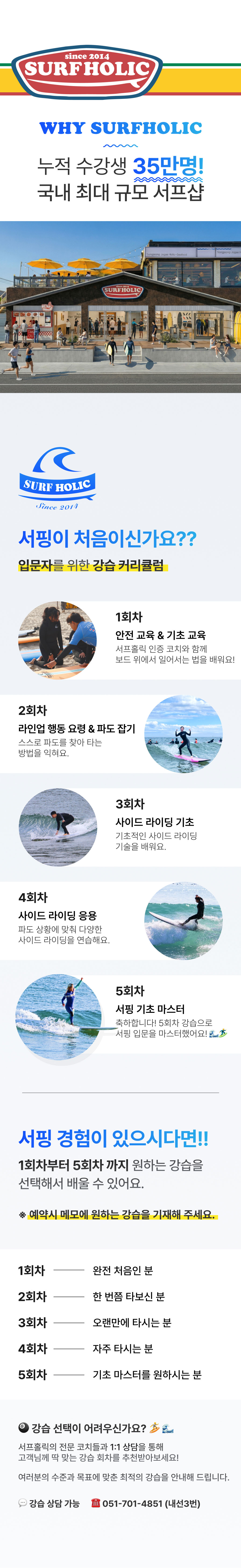 - 기상악화 : 태풍주의보, 태풍경보, 풍랑경보, 기타 서프홀릭 대표코치 판단에 의한 강습불가 인 경우 (비 내린다고 강습이 취소 되거나 연기 되진 않습니다.)